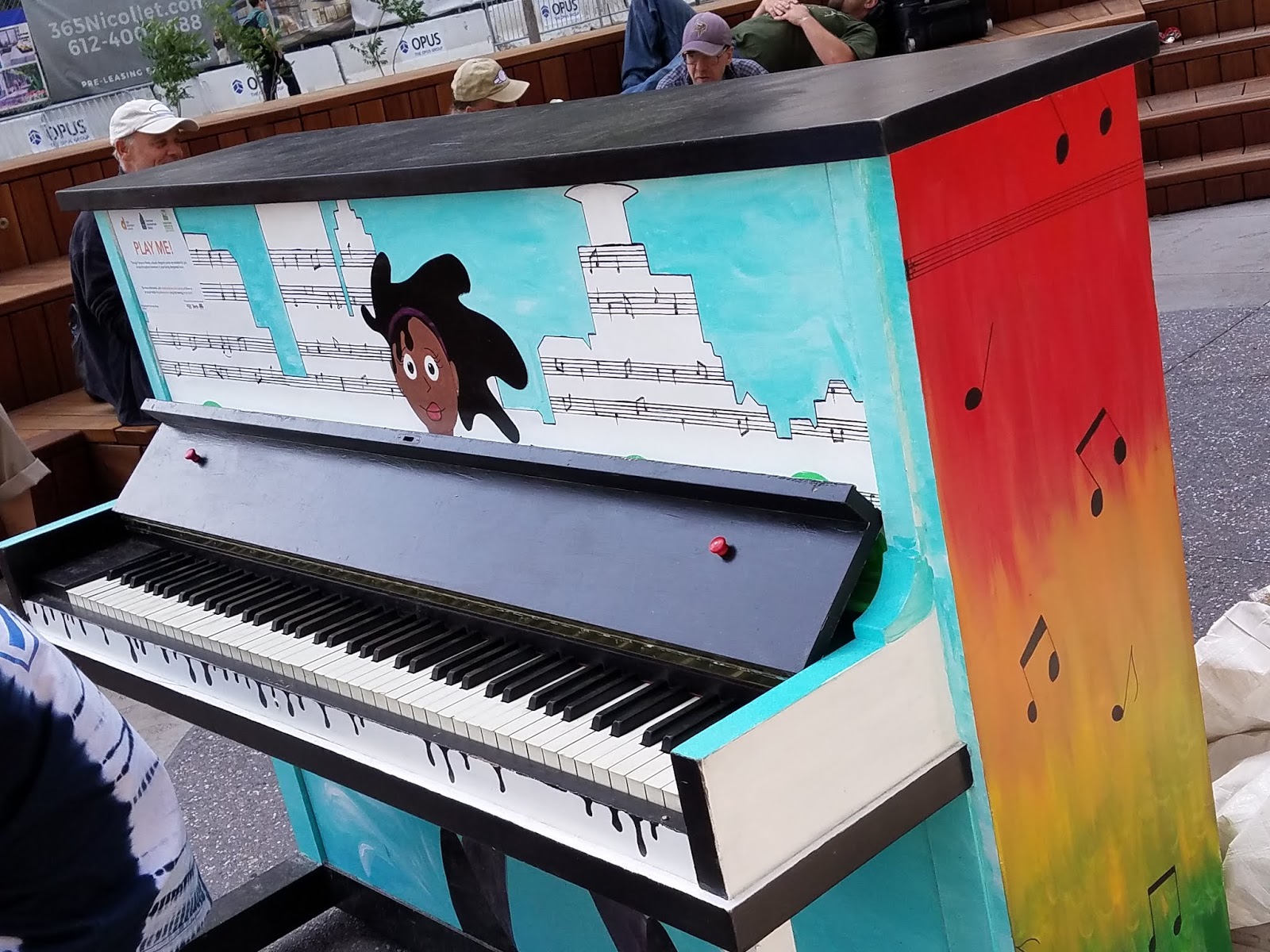 Thursday was a beautiful summer day in Minneapolis. A great day to walk around, maybe check out a food truck or a stall at the farmer's market, or maybe find someone playing a piano. I love the lid on the piano at the Hennepin County Government Center; many of the pianos have designs on the side, but I don't recall seeing too many with such a bold design on top. I love this. There are several new locations this year, and one is in the little park at St. Olaf's Church. There was someone playing, but there was horrible construction noise all around, so there was no sense in trying to record him. Of course Prince is on a piano (and actually more than one in some fashion or other), and I love the one at Kieran's. I think I have roughly half of the pianos accounted for, perhaps a little more. Maybe a trip to Loring Park tomorrow for the three or four out that way. If it doesn't rain.